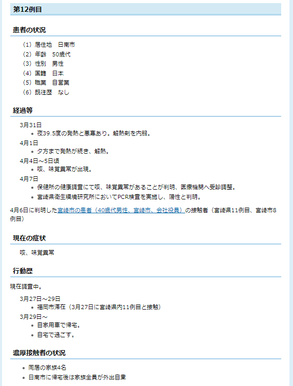 12例目、日南市で初の感染者。接客業ではない自営業の方。