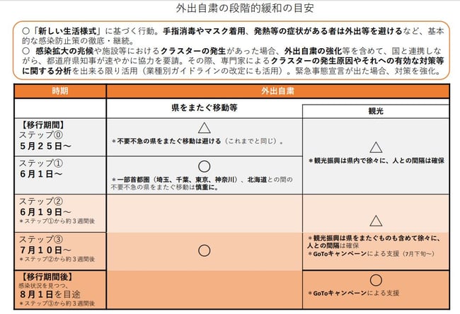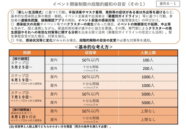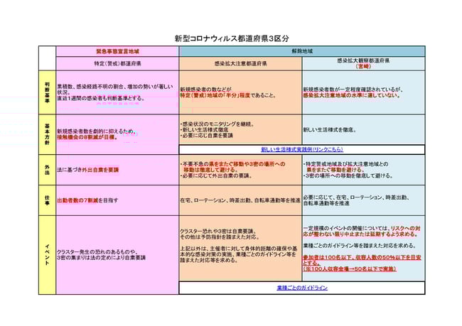 「感染確認地域」は直近1週間の▽新たな患者の数などが前の週から一定程度の増加幅に収まっていることや▽帰国者・接触者外来を受診した人があまり増加していない状況としました。想定される対策としては「3つの密」を徹底的に避ける対策をしたうえで、感染拡大のリスクの低い活動については、実施するとし、具体的には、屋内で50人以上が集まる集会やイベントへの参加は控えることとしました。