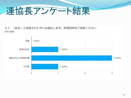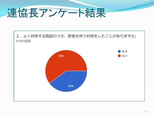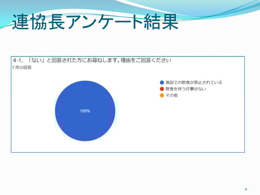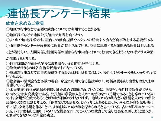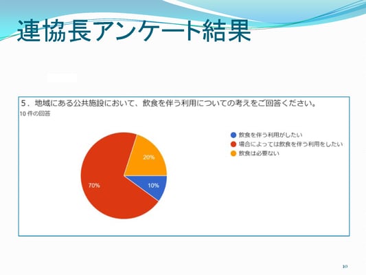中10地区のからですね回答 を得ることができました。これには感謝を申し上げます。ご覧の通りですね、施設について飲食ができるできないをお尋ねする問いになん ですけれども、こちらについてですね飲食 ができないと答えた地区が100%あるということでこれについてはですね、市から 飲食が禁止されているということでございました。また8つの地区でですね、八割の 地区で飲食を伴う利用がしたい、場合によっ
