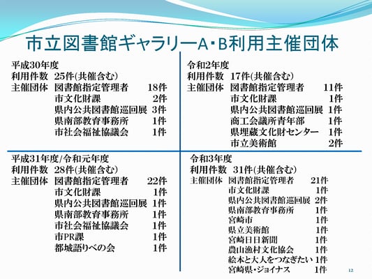 次に、都城市立図書館のギャラリー利用について 質問をして参ります。図書館にはですね、ご存知ある方見にした方たくさんいらると 思うんですけれども駐車場から1番目立つ 場所にですねガラス張りの角のところですけれども、ギャラリーABというものが設置 されております。このギャラリーにつきまして、複数の市民の方から今年に 入りまして市民団体等でですね利用ができないという相談を受けました。そこでです ねえ担当課の方に資料請求を行いまして開館から昨年度までギャラリーABを利用 した主催団体お調べしたところですね、表示しております通りえほとんどがす図書館指定管理者が主催のもの、もしくは市が関連するものですね、指定管理者が運営に協力したもの、こういったものがもう大半を占めておりました。市民の団体等が利用されたものていうのはですね、数えてみると全体の3%程度しか 見受けられなかったということで、資料をご覧いただければと思うわけですわけです けどけれどもこの断られた理由というですかね、市民団体が使えない理由をお尋ねした ところこの団体の皆さんからですね図書館から断られたというご意見をいただきまし た。これにつきましてですねまこれは市の意向なのか、ものすごくですね利便性の 高い目立つ場所にある施設でございますので今後ですね扱いを見直して市民に広く 解放していくべきと私は考えるわけですけれども考えをお尋ねします。