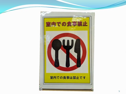 こちらですね先日会議で訪れた五十市地区公民 館のに貼られていた張り紙でございます。飲食禁止とですねこれが部屋の中に何枚も 貼られておりました。こういった形で飲食が禁止されてる公共施設がたくさんある わけでございますけれども、これまでですね、飲食ができていた施設も建物の改築リニューアルに伴って飲食ができなくなっているという市民相談をいいておりますし、私も実際地元のですね山之口センターがそのように該当する施設になってしまいました。そういうことでですね連協長や公民館の方々から相談をいただきましたので色々調べているところでござい ますけれども、この市としてですね公共施設での飲食が禁止されている根拠と理由と いうのがですね一体何なのかお尋ねいたします。