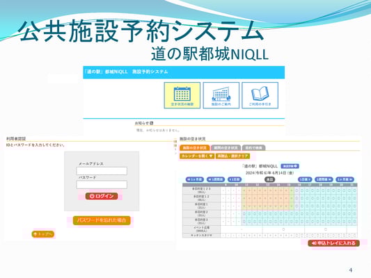 市民に貸出しを行っている公共施設の 予約システムは令和5年度に導入した公共施設予約システムの他、総合文化 ホール、ウェルネス交流プラザ及び周辺施設、都城ニクル、勤労身体障害者教養文化体育施設の計5つのシステムが稼働しております なお公共施設予約システム以外のシステムについては公共施設予約システム構築前に 導入しているものでございます、
